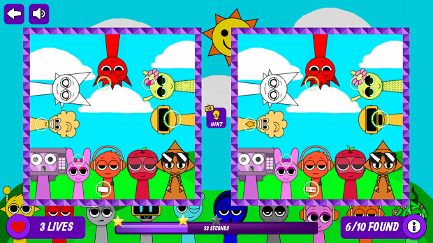 Each level in Sprunki Find The Differences presents two vibrant and colorful pictures of Sprunki characters. Players are in charge of spotting ten small differences within a particular time. This game offers two lives for each stage! As you complete your current level effectively within limitation time, you win the game and take the ticket for the next exhilarating stage. On the other hand, you need to start over if the timer goes out while falling to find all differences or make more than two mistakes.